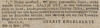 [[File:1805 aaltje ott.jpg|thumb|200px]]Maandag <u>27 mei</u> is begraven in de Grote Kerk (zuidzijde 11) te Hoorn '''Aaltje Ott''' (kosten ƒ7:7:-) <small>[dtb 86/76]</small>; impost ƒ8 <small>[dtb 84/103]</small>. Bericht door ''Gerrit Engelberts'' in ''Oprechte Haarlemse courant'' van <u>28 mei</u> [].