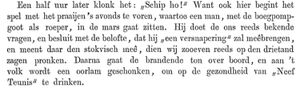 Men weet, dat de namen van heiligen, nu als voornamen veelvuldig voorkomende, in Friesland eerst betrekkelijk laat zijn ingevoerd, dat zij daar voor de invoering van het Christendom niet voorkwamen, en dat het ook na de invoering van het Christendom nog vrij lang duurde eer de Friezen hunne goede friesche namen voor die vreemde namen wilden wegwerpen. Men weet ook, dat Antonius tot die heiligennamen behoort, en dat deze naam veeltijds verkort wordt tot Teunis. Maar deze kronijk vertelt het ons anders. Er was — de lezers van den Navorscher zullen ons misschien naauwelijks willen gelooven, maar inderdaad het staat op bl. 238 van het Verslag te lezen — er was “een friesche viking, zeekoning, thuis behoorende te Alderga (Ouddorp niet verre van Alkmaar). Zijn naam was Teunis, in de wandeling bij zijne manschappen Neef Teunis genoemd, die vooral de Middellandsche zee tot het doel en tooneel zijner tochten gekozen had, en door de Tyriers vergood zoude zijn, in den tijd toen de Phenicische zeevaart zich merkelijk begon uit te breiden en naar Friesland stevende” Derhalve een Teunis in Friesland een aantal eeuwen voor onze tijdrekening, en die neef Teunis door de Pheniciers in Neptunus omgeschapen en onder dien naam aan de Romeinen overgedaan!