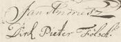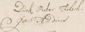 - ↑ Dirk Pieter Fölsch (gerechtsdienaar ten minste in 1759 [NAE 1383/145], elders ook: Pietersz Folsch, Füld, Vulst, Vark, Yurk, Turk) moet een bekende te zijn geweest (zie ook 1756 en 1759), ten minste via Hendrikje Harmens, die in 1758 getuige was bij de doop van zijn zoon Jelle. Zij was ook vier maal getuige, tussen 1746 en 1750 bij de doop van kinderen van Jan Andriesz. Fölsch (van Hamburg) was Luthers lidmaat in 1730, toen hij inscheepte op het VOC schip Geertui. Hij trouwde in 1735 (wonend op de Vrijdom) met Jantjen Frans en in 1751 (won. Hoogstraat) met Dieuwertje Jans.