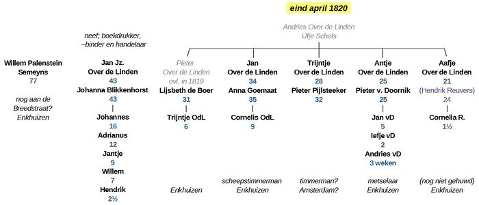 Zaterdag 12 september is geboren (buitenechtelijk) kleindochter Cornelia Reuvers, dochter van Aafje over de Linden van beroep werkster en wonende (...) in het huis (...) op de Sijbrandsdijk (en van Hendrik Reuvers, die niet in de akte wordt genoemd, maar met wie ze in oktober 1820 nog een zoon zou krijgen en pas in mei 1821 zou trouwen) [bs 1818g/39 akte 13-9, aang. door vroedvrouw Elisabeth Schuit].