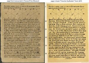 - ↑ De afdruk der plaat uit het Oera Linda boek is in deze Friesche Oudheden opgenomen om tot toelichting te strekken van het Verslag van Dr. Ottema, in de Vrije Fries, XII 223, opgenomen.
