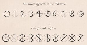 Want de Arabieren zelve hebben die sijfers nooit gebruikt. Hunne sijfers hadden den vorm: ١٢٣٤٥٦٧٨٩٠ En met deze komen onze sijfers niet het minste overeen. Erpenius (Gram. Arab.) schrijft, dat de Arabieren deze sijfers van de Indiers hebben ontvangen.