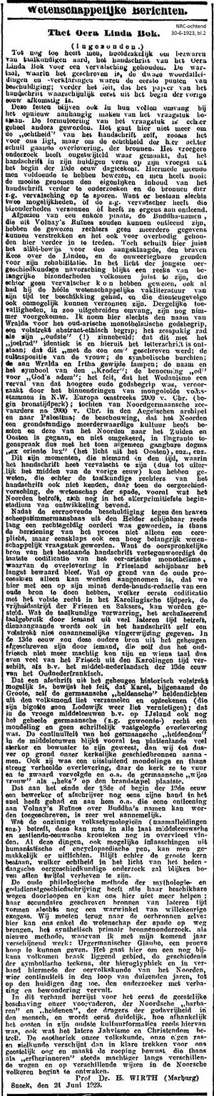 Ingezonden bericht van Herman Wirth in de Nieuwe Rotterdamsche Courant, 30-6-1923 ochtendblad, blz. 2, onder wetenschappelijke berichten - JJK245.